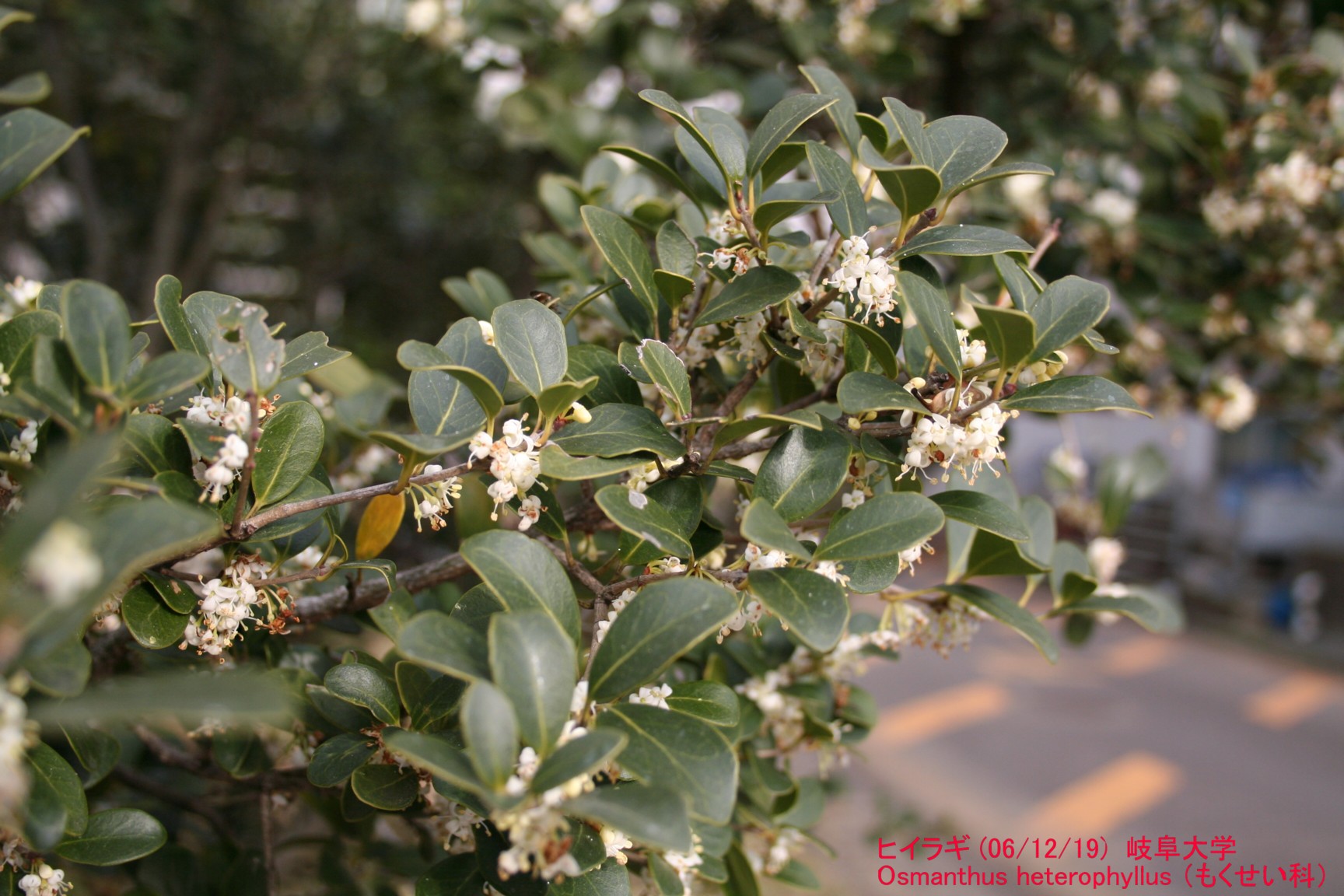 ヒイラギ(柊) もくせい科。 まさに、木に冬と書いてヒイラギ、冬の花です。節分の「魔除け」に 家の軒先に飾ったりする木です。棘々の葉が魔物を追い払ってくれる と信じたのでしょうか。私は子供の頃に、葉の棘を支点にして指で挟んで、 風車のように回して遊んだことを覚えています。とにかく、ヒイラギと あの棘々とは、一身同体です。 でも、この写真、ご覧のとおり葉っぱは全縁で、 棘々がありません。なので、私も最初は一月ぐらいこの花を同定できませんでした。 モクセイの仲間であることは分かったのですが、まさかあのヒイラギとは。 で、図鑑の解説に、「老木では全縁となり」とあるのを見つけ、 ようやく納得したのです。でも、正しくは「老木」ではなく、老枝です。 良く見ると、新しい枝にはちゃんと棘々の葉っぱが付いています。 ただ、棘々の葉っぱの枝には、あまり花は咲かないようです。