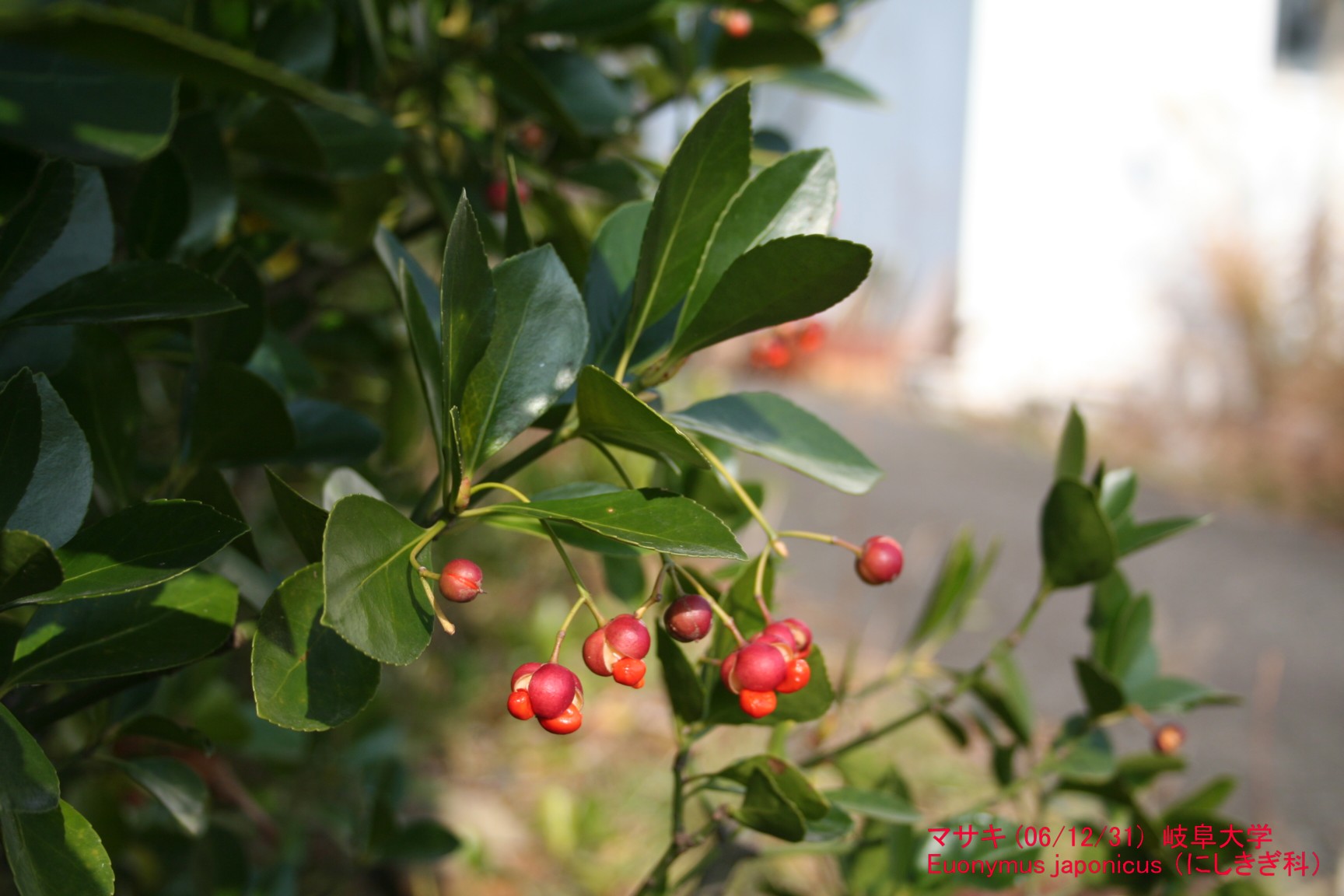 マサキ・実(正木、柾) にしきぎ科。 マサキの花は初夏に小さくて目立たない緑色の花をつけますが、 他のニシキギ科の植物と同じく、赤く目立つ提灯のような実をつけます。 名前の由来は、WEBで検索をしたのですが、あまりはっきりしません。 マサヲキ(真青木)とするものもありますが、とくに緑が目立つという ほどでもないし。 でも、刈り込みに強いのと、赤い実が美しいので、良く庭木にされます。 冬の殺風景な庭に、赤いコントラストは貴重です。 私のイメージでは、雪を少しかぶったところで、緑と白と赤が一番映えるかと。 岐阜大学では(おそらく前者の理由で)至る所に植えられています。