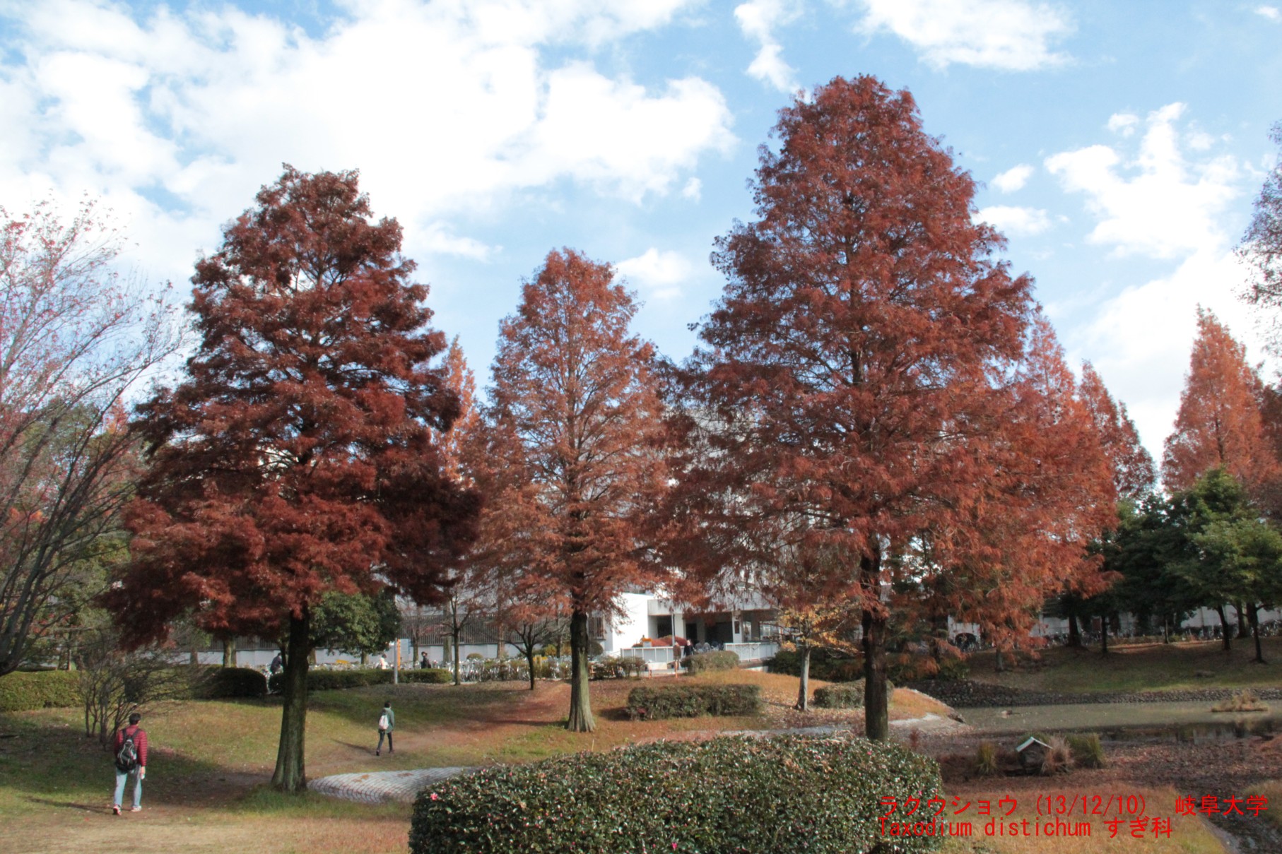 この季節、岐阜大学の丸池前に立つと、茶色く紅葉(?)した