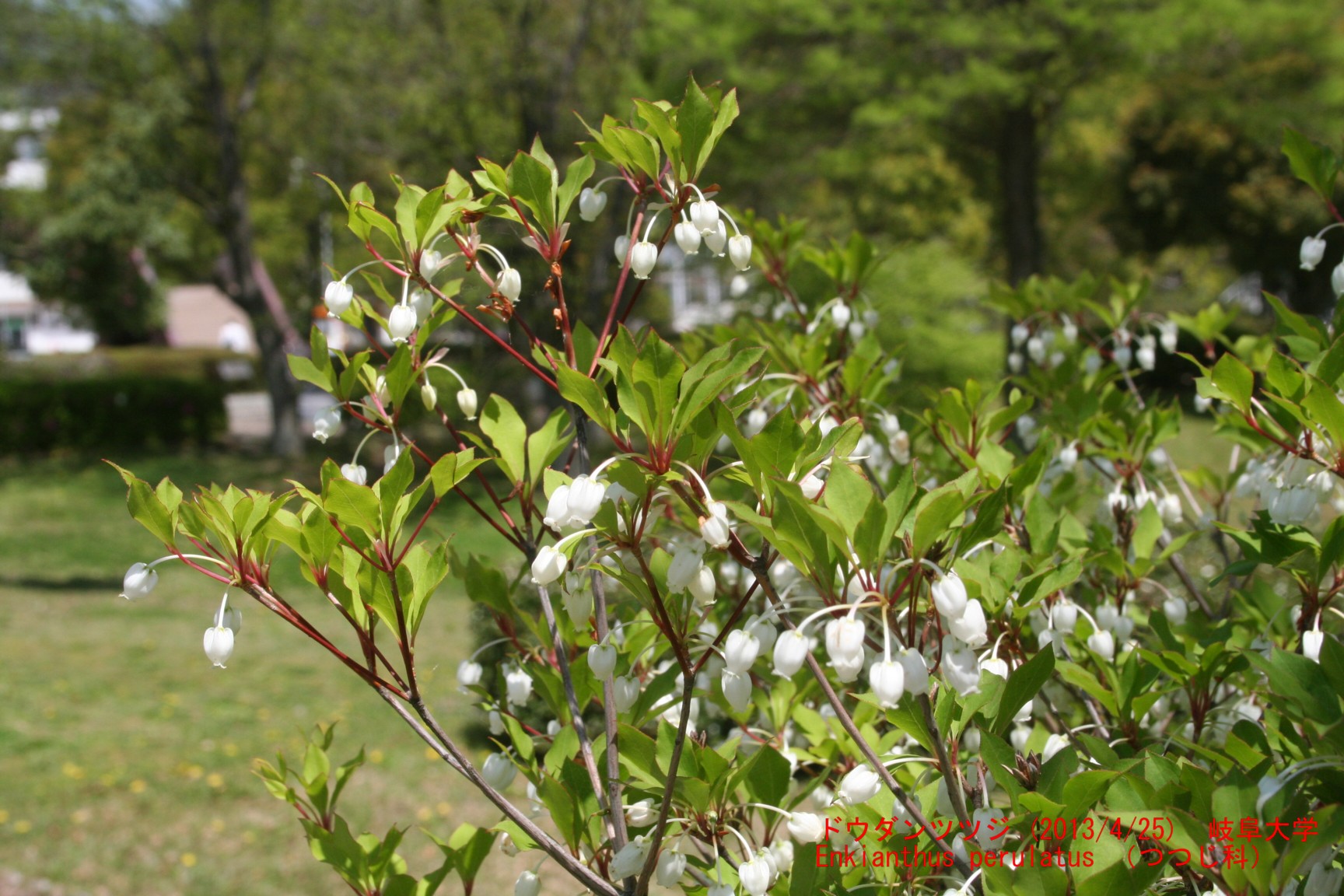 落葉低木で、春に葉の出た少し後に、真っ白な釣鐘型の小さな花を多数つけます。