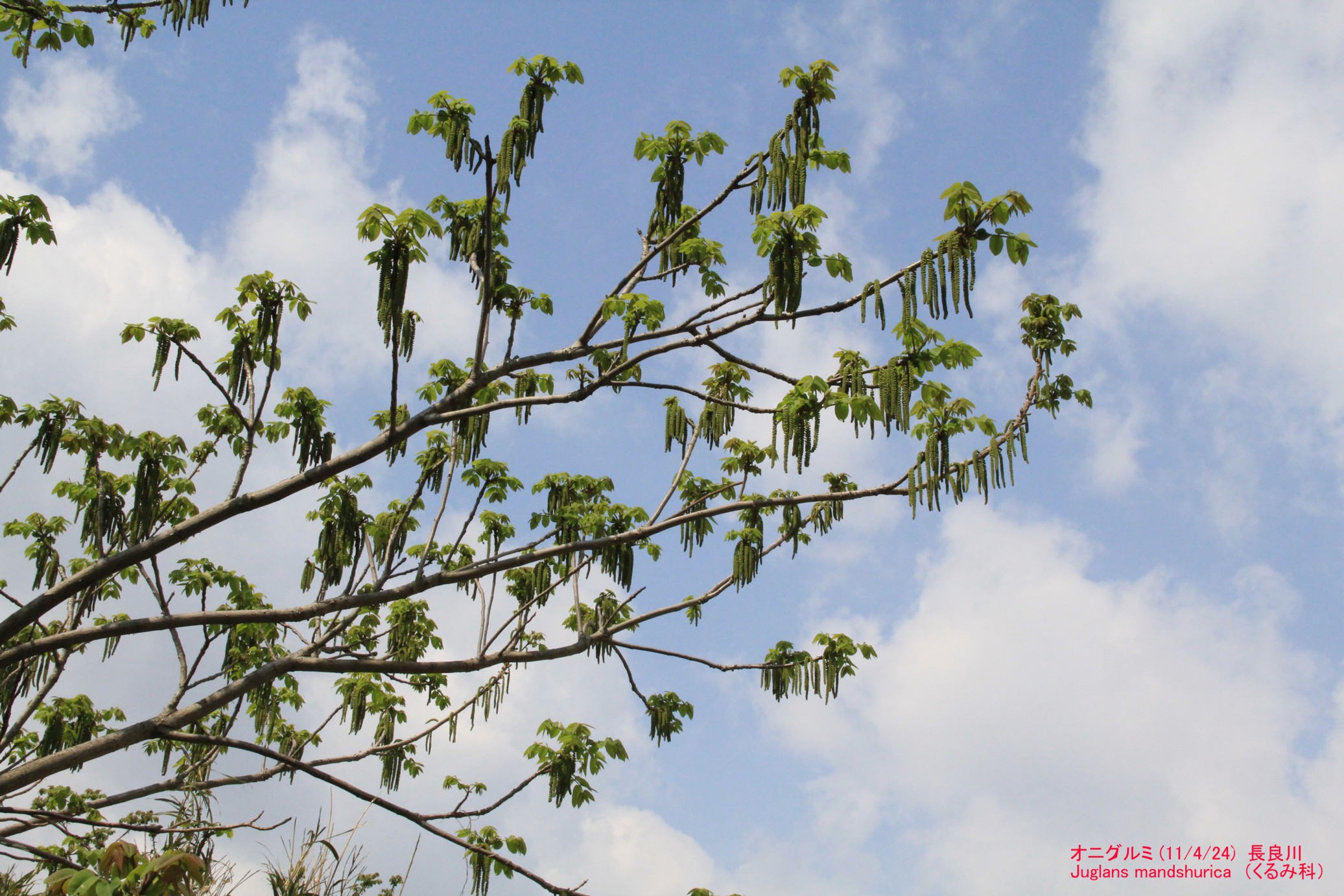 オニグルミ(鬼胡桃) くるみ科。雄花(上・左)、雌花(下・右)