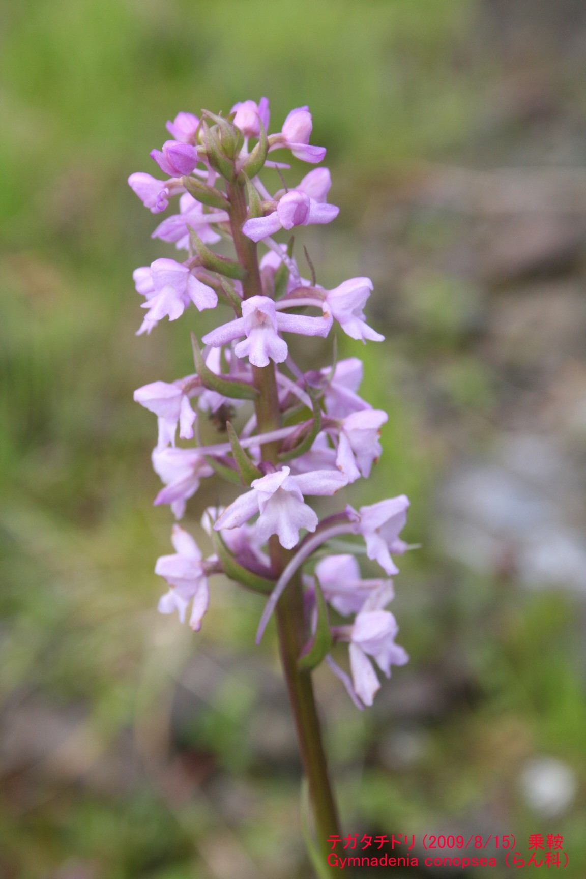 亜高山~高山帯の湿った草地に生える多年草です。花の割に長い花軸が目立ちます。